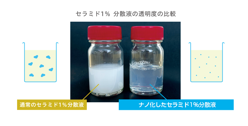 セラミドをナノ化(微細化)することにより、セラミドを水の中で透明に分散することが可能となります。化粧品に応用することで、セラミドを肌に届けます。