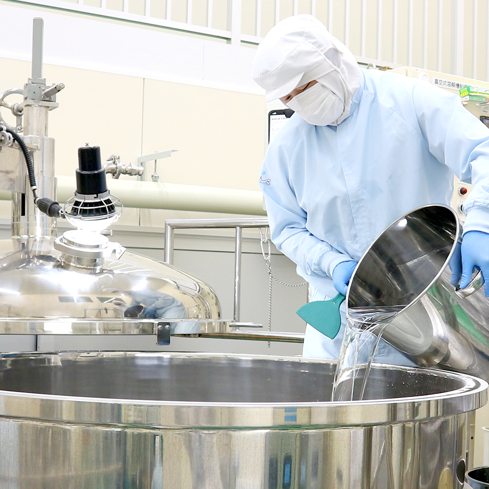 化粧品の中身を、原料を処方の指示通りに計量し、製造窯で原料を混ぜ合わせていきます。