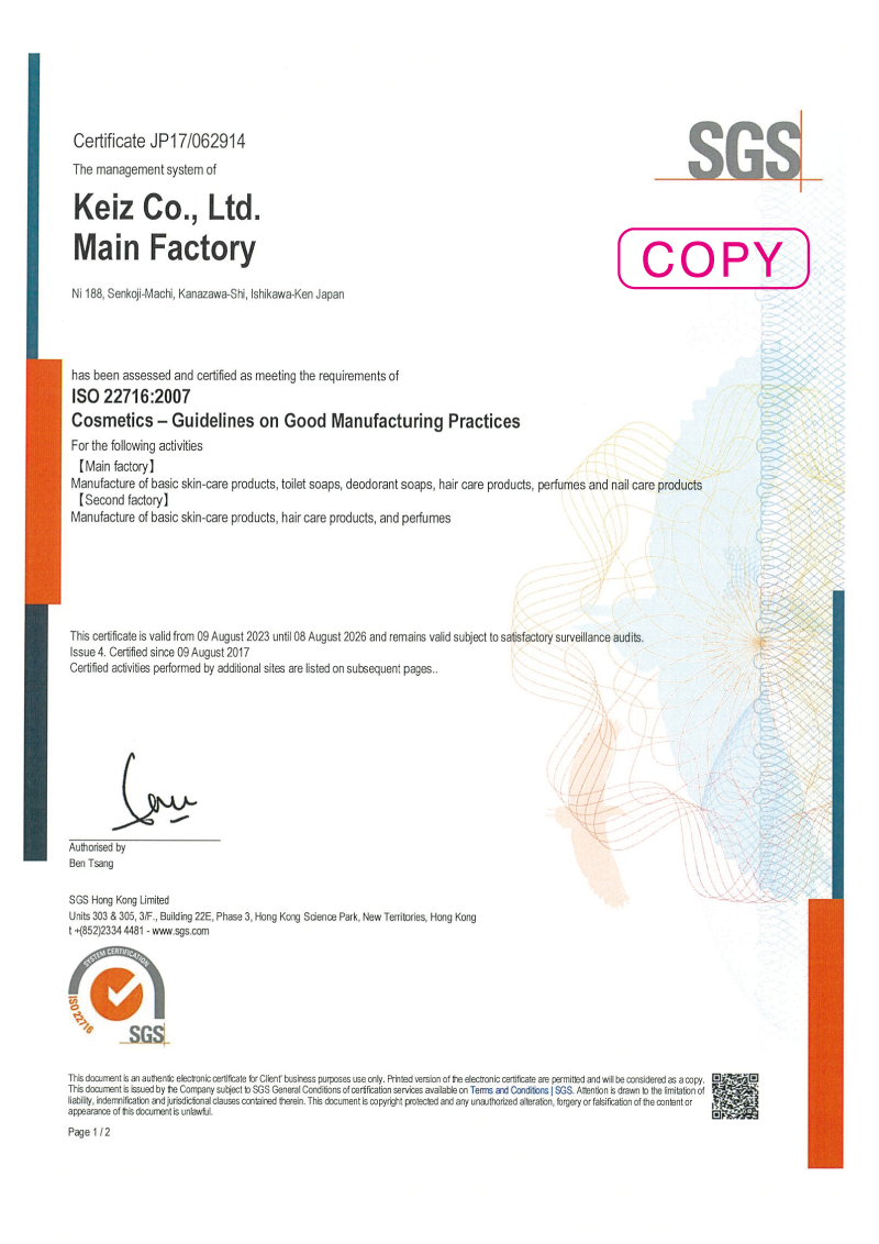 化粧品の製造及び品質管理に関する国際規格 ISO22716(化粧品GMP*)の認証を取得