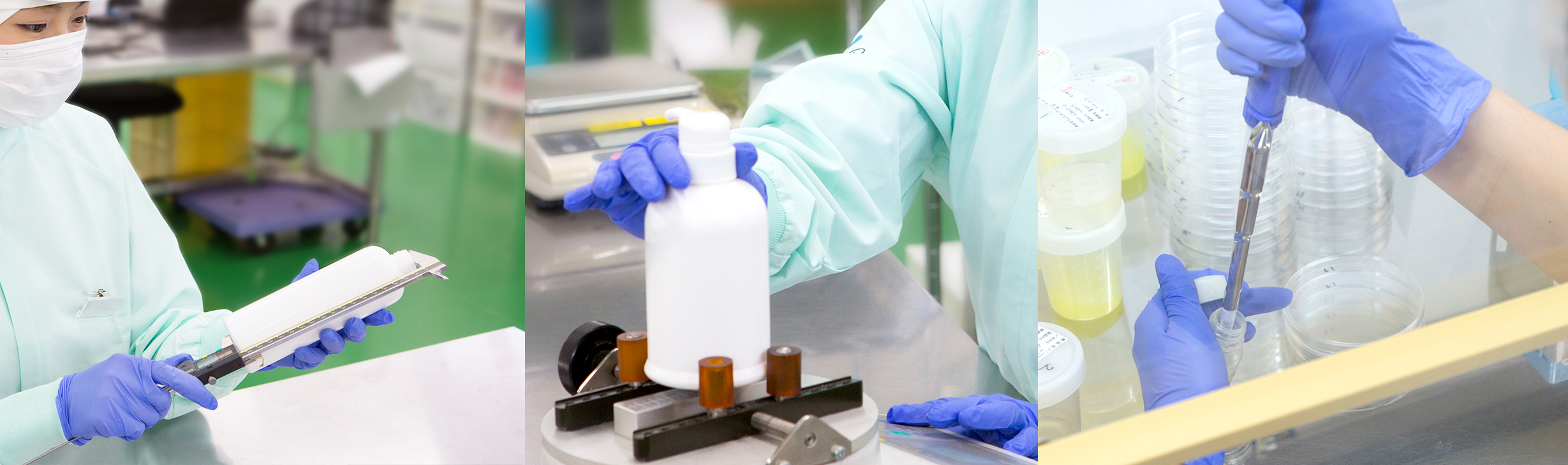 製造段階のpH、比重、粘度、菌検査など厳密な検査に、完成品の出荷検査まで。